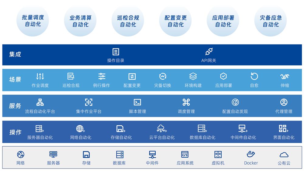 提供组织级全流程自动化运维,,,,可以把企业最佳的运维流程固化为模板,,,实现对任意数量 IT 资源的批量标准化执行,,完成配置变更、、、数据收集、、环境构建、、、、故障自愈、、、、资源调整、、应用部署、、自动巡检等场景的自动化,,,,显著提升日常运维工作的效率和可靠性,,,缩短操作时间、、、降低运维操作的成本和操作风险。。