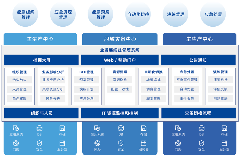 基于业务连续性全生命周期管理的设计理念,,,采用一体化的技术管理平台,,,,将风险分析、、业务影响度分析、、、预案开发和管理、、、、应急演练、、应急响应、、应急恢复等业务连续性相关工作全面覆盖,,帮助企业实现数字化的预案建模、、、、资源实例化、、预案演练、、预案自动化执行、、、、审计改进等各环节的闭环管理。。。。
