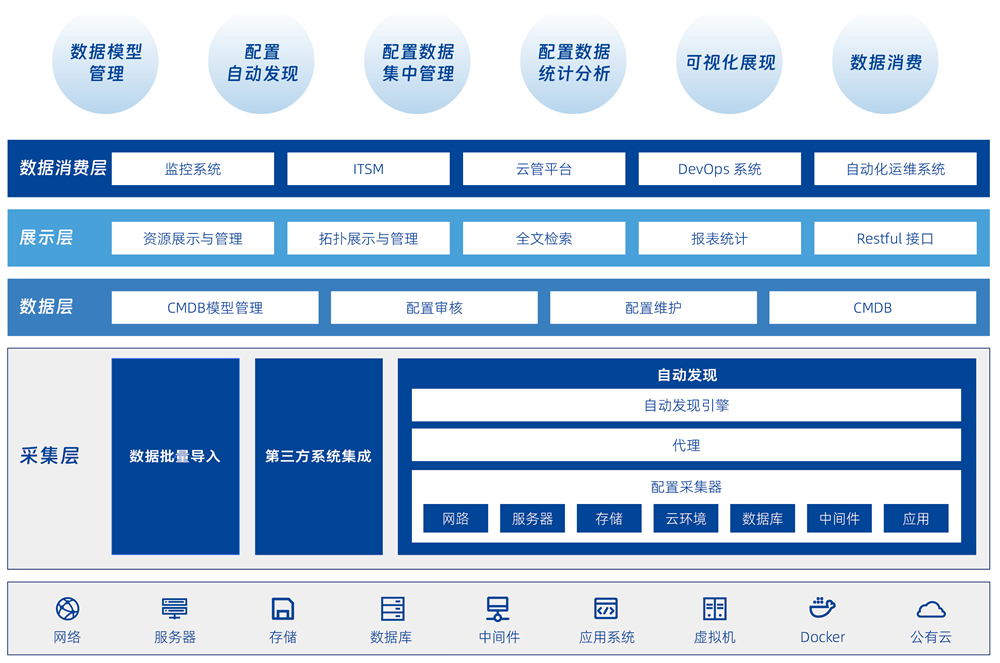 帮助用户建立统一的运维主数据,,,通过各种自动化手段实现以应用为核心的全面资源管理以及运维消费场景共享。。。。系统具备灵活的 CMDB 分层建模和配置信息维护机制,,,可以提供面向业务的 IT 架构画像,,,,为各个运维工具提供集中化的资源信息管理和协同,,,,为 IT 运维和 DevOps 体系下的各种运维场景提供数据消费服务。。
