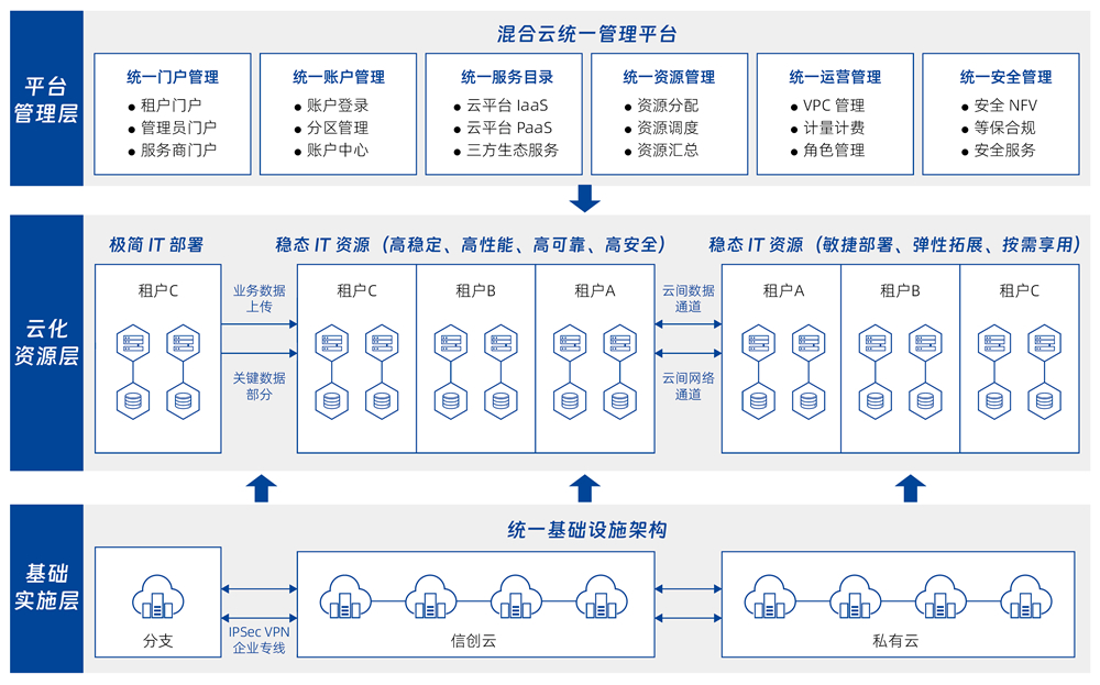 面向已部署多云、、、、信创基础设施的行业用户,,,,提供自助化、、自动化的云服务快速交付服务。。。。管理企业内部多个数据中心的物理、、、、虚拟资源,,以及容器、、、、私有云、、、、公有云资源,,,并对以上资源进行混合编排,,,,提供基础软件和应用软件的自动化部署服务,,,以及云资源的全生命周期管理。。。