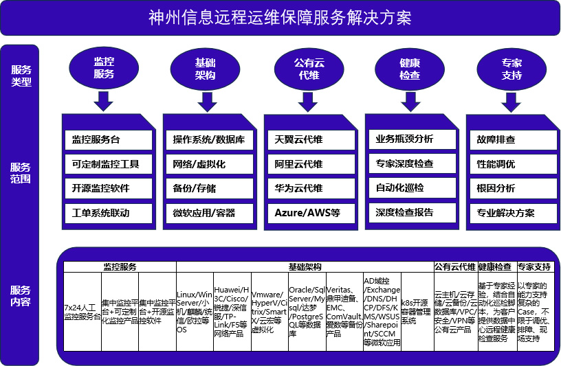 依托7×24小时智能监控中心、、、专业化运维管理平台及资深级技术专家团队,,,构建三位一体的远程运维服务体系,,,,提供包括对公有云、、、、私有云、、机房、、网络、、、、服务器、、、操作系统、、、、存储、、、备份、、、数据库、、中间件、、应用、、、、安全等ICT基础设施的远程保障服务。。为客户数字化转型、、人工智能、、、云计算、、物联网、、、区块链、、、、数字资产等前沿技术领域保驾护航,,,,驱动客户数字创新进程。。。。